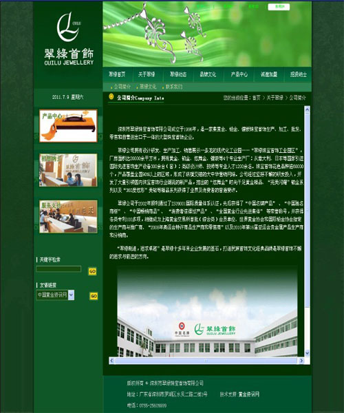 翠綠公司擁有設計研發、生產加工、銷售展示一條龍的現代化工業園——“翠綠珠寶首飾工業園區”,廠房面積達20000余平方米,擁有黃金、鉑金、炫舞金、鑲嵌等4個專業生產廠;從日本、意大利等國家引進國際先進首飾生產設備300余臺(套);高級技師、設計師等專業人才1200余名。珠寶首飾花色品種逾60000個,產品覆蓋全國90%以上的區域,形成了縱橫交錯的大中華營銷網絡。公司經過堅持不懈的研發投入,開發了大量引領國內珠寶首飾行業潮流的新產品,推出的“炫舞金”時尚千足黃金精品、“完美閃耀”鉑金系列以及“360度炫彩”美鉆等精品系列獲得了業界及消費者的普遍贊許。