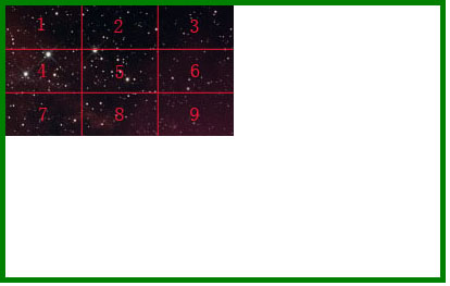 注: 本文中使用的圖片大小為 300px*120px,為了能很清晰的表達圖形的哪部分被隱藏了,按照圖片的大小平均分成了9等份。同時背景圖片容器區域繪制出綠色邊框清晰顯示容器的范圍。