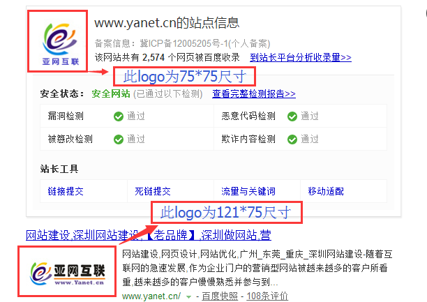 a.LOGO提交尺寸:PC/移動(dòng)站可提交121*75、75*75、84*52三種尺寸的圖片。其中121*75尺寸的LOGO用于PC檢索時(shí)候展現(xiàn)在TITLE下方、75*75尺寸的LOGO用于使用SITE命令的時(shí)候展現(xiàn)、而84*52尺寸的LOGO則主要是自適應(yīng)站、具有獨(dú)立移動(dòng)站等網(wǎng)站在移動(dòng)端展示的。