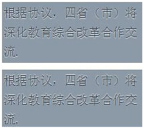 <head> <meta charset="UTF-8"> <title>Document</title> <style> body{ font: 110%/1.6 Baskerville, Palatino, serif; /*字體過小表現(xiàn)不出樣式*/ } .wrap{ width: 200px; background: hsl(210, 13%, 60%); color: hsl(210, 13%, 30%); padding: .1em; text-shadow: 0 1px 1px hsla(0, 0%, 100%, .8); } .wrap02{ margin-top: 10px; width: 200px; background: hsl(210, 13%, 60%); color: hsl(210, 13%, 30%); padding: .1em; text-shadow: 0 -1px 1px hsla(0, 0%, 100%, .8); } </style> </head> <body> <div class="wrap"> <span>根據(jù)協(xié)議,四?。ㄊ校⑸罨逃C合改革合作交流.</span> </div> <div class="wrap02"> <span>根據(jù)協(xié)議,四省(市)將深化教育綜合改革合作交流.</span> </div> </body>